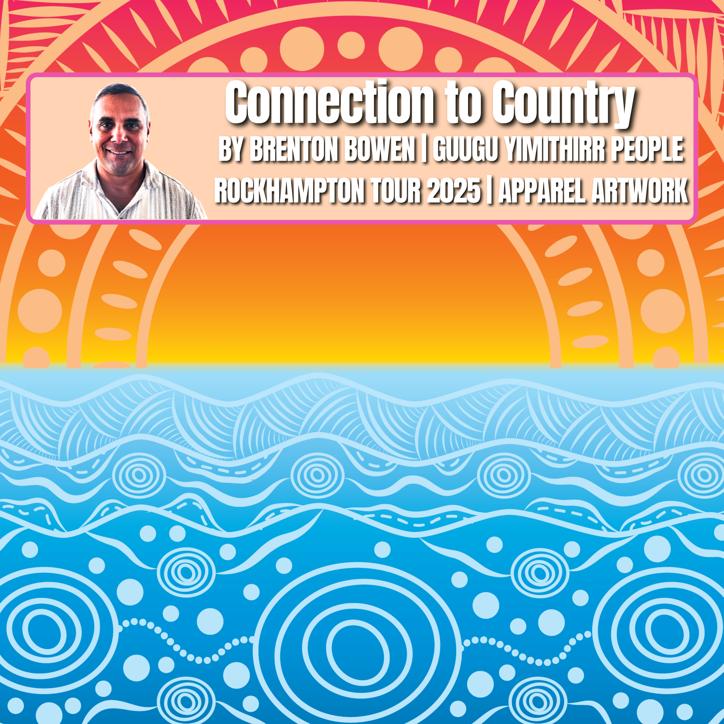 As the sun meets the horizon, it transitions into the ocean — a powerful source of life, movement, and identity. The flowing wave patterns represent the rhythm of community, the journeys we take, and the connection to sea country. The circles within the water symbolise people — families, communities, and gathering places — all connected through shared stories and culture.